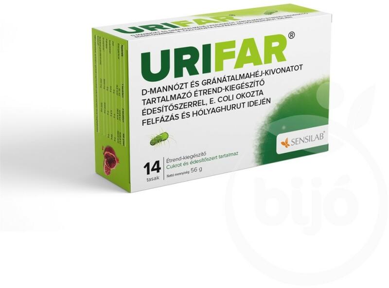 D-mannózt és gránátalmahéj-kivonatot tartalmazó étrend-kiegészítő édesítőszerrel, E. coli okozta felfázás és hólyaghurut idején. Jellemzők D-mannózt és gránátalmahéj-kivonatot tartalmazó étrend-kiegészítő édesítőszerrel, E. coli okozta felfázás és hólyaghurut idején Adagolási javaslat A javasolt napi adag 1 tasak 2 dl vízben feloldva, éhgyomorra, a húgyhól