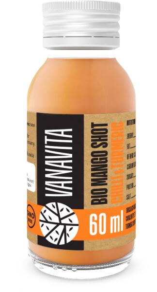 Bio Mango Shot Chili&Kurkuma - VanaVita A Bio Mango shot chilli&turmeric az édes mangó. fűszeres kurkuma és chili kombinációja. Fogyasztásával pótoljuk a szükséges vitaminokat, ásványi anyagokat és antioxidánsokat. Minden összetevő bio minőségű és a keverék nem tartalmaz hozzáadott cukrot, édesítőszereket, sem tartósítőszereket. A VanaVita speciálisan vegánok