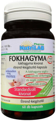 NutriLAB FOKHAGYMA vega 60x fokhagyma kivonat étrend-kiegészítő kapszula A fokhagyma segíti a mikroerek vérkeringését és segíti csökkenteni a nehézláb-érzést. Napi adag1 kapszulaFokhagyma kivonat porban (Allium sativum)400 mg Összetevők: Fokhagyma kivonat por, hidroxi-propil-metil cellulóz (kapszulahéj) A fokhagyma kapszula allicin tartalma 0,1% (0,5 mg). Tartalom: 60 db kapszul