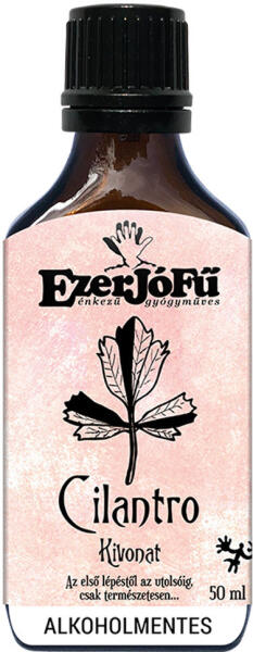 Az EzerJóFű Koriander+ alkoholmentes kivonat egy 50 ml-es természetes készítmény, amelyet gyomorerősítő, görcscsillapító, szélhajtó és féregűző hatása miatt alkalmaznak. A koriander (Cilantro) kivonat növényi glicerinnel és rendezett vízzel készült, támogatja az emésztést, serkenti a nemi vágyat és segíthet a nehézfémek eltávolításában. Alkalmazás: 3×20-40 cs