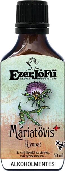 Az EzerJóFű Máriatövis+ alkoholmentes kivonat egy 50 ml-es, komplex máj- és epevédő gyógynövénykészítmény, amely Máriatövis, Fekete üröm, Pitypang, Bojtorján és Kis ezerjófű kivonatot tartalmaz. A Máriatövis herba segít a máj regenerálásában és méregtelenítésében, míg a Fekete üröm, Pongyola pitypang, Bojtorján és Kis ezerjófű hozzájárulnak az emésztés