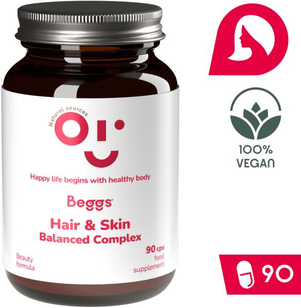 BEGGS Hair&skin Balanced Complex, étrend-kiegészítő, 90 db kapszula Étrend- kiegészítő L-metioninnal és biotinnal A puha és erős hajért és a ragyogó arcbőrért. Az étrend-kiegészítő napi adagban (1 kapszula) 50 μg biotin és 500 mg L-metionin esszenciális aminosav kombinációját tartalmazza. Ez az aminosav a keratin építőfehérje természetes összetevője. A haj és