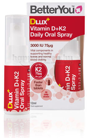 Termék leírása: BETTERYOU DLUX D+K2-VITAMIN SPRAY 12MLTermék összetétele:A BetterYou DLux+ D-vitamin+K2 egy kiváló felszívódású hatóanyagokat tartalmazó szájspray: 3 fújás 3000 IU (75 μg) D-vitamint és 75 μg K2-vitamint tartalmaz, a csontok egészségének optimális támogatása, hatékony és gyors felszívódású szemben a tablettákkal, kapszulákkal, természetes borsment
