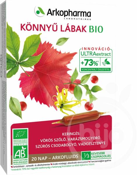 Vörös szőlő, varázsmogyoró, szúrós csodabogyó és vadgesztenye. 20 db-os ampulla; Arkopharma termék a lábak komfortjához és a könnyed láb érzéséhez. Szigorúan válogatott ökológiai termelésből származó gyógynövényekből. A vadgesztenye és a varázsmogyoró hozzájárulnak a nehéz láb érzés csökkentéséhez. A vörös szőlő és a csodabogyó hozzájárulnak a lá