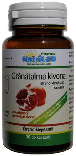 NutriLAB Gránátalma kivonat vega étrend-kiegészítő kapszula 30x Növényi kapszulában-vegetáriánusok is fogyaszthatják! 40% ellágsavra standardizált kivonat Napi adag1 kapszula Gránátalma gyümölcshéj kivonata (Punica granatum) 40% ellágsavra standardizálva 30 0 mg Összetétel: gránátalma kivonat standardizált kivonata, kukorica keményítő, hidroxi-metil-propil-cellulóz (k