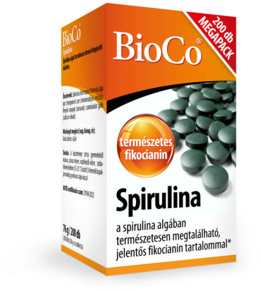 BioCo® SpirulinaGyártó cikkszám: SB00081EAN kód: 5998607102492 Spirulina algát tartalmazó étrend-kiegészítő tabletta A spirulina (Arthrospira Platensis) egy emberi fogyasztásra alkalmas cianobaktérium faj. A Föld egyik legősibb élőlénye, melyet már az aztékok is fogyasztottak. Számos kultúrában a spirulina ma semhiányozhat a napi étrendből. A kékes-zöld színű Spirulin