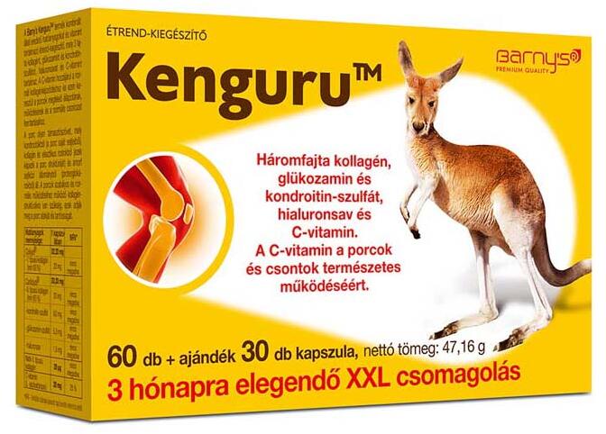 BARNYS KENGURU ÉTREND KIEGÉSZÍTŐ 90DBÖsszetevők: Töltőanyag (kukoricakeményítő), kapszulatok (zselatin, színezék– titán-dioxid), Cartidyss® (II. típusú kollagén proteinek, kondroitin-szulfát, glükozamin-szulfát, hialuronsav), Collyss® (I. típusú kollagén proteinek, hidroxiprolin), L-aszkorbinsav, oldószer (magnézium- sztearát), natív II. típusú kollagén. A Barny´