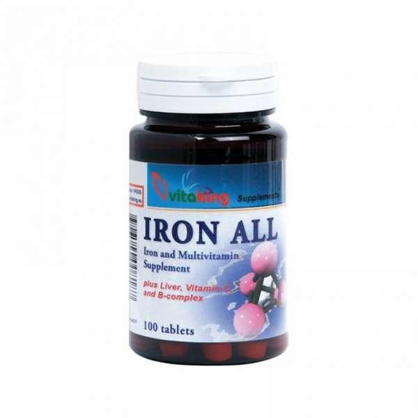 Vitaking: Vas Komplex A Vitaking Vas komplex (Iron All) egy speciálisan összeállított komplex formula, ami a vason kívül tartalmazza többek között a B-vitamin komplex tagjait, beleértve a folsavat és a B12-vitamint , valamint a felszívódáshoz szükséges C-vitamint is. A vas a vörösvérsejtek oxigénszállító összetevőjének , a hemoglobinnak egyedi elengedhetetlenül fontos al