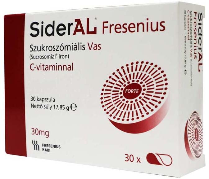 SiderAL® Fresenius - Szukroszómiális VasC-vitaminnal30mg - 30 kapszula – Nettó súly 17,85 g FORTEA SiderAL® Fresenius étrend-kiegészítő szukroszómiális vasat (Sideral® r. m. Sucrosomial® Iron) és C-vitamint tartalmaz. Ajánlott vastartalom szempontjából elégtelen étrend (például nem kiegyensúlyozott diéta, vegetáriánus táplálkozás) miatt kialakuló hiány, vagy megnö