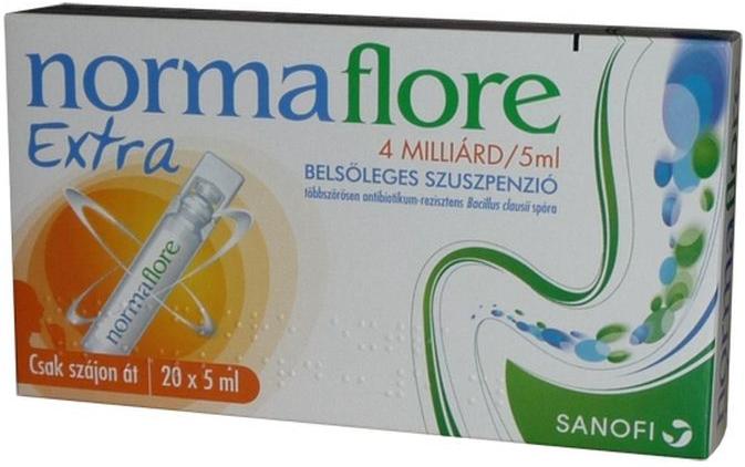 A Normaflore Extra 4 milliárd/5 ml belsőleges szuszpenzió probiotikum, 4 milliárd, négy fajta, többszörösen antibiotikum-rezisztens Bacillus clausii törzs (O/C, N/R, SIN, T) spóráit tartalmazó gyógyszer. Csak személyes átvétel vagy kiszállítás szakszemélyzettel Szegeden. Normaflore Extra 4 milliárd/5 ml belsőleges szuszpenzió (20 x 5 ml) A Normaflore Extra helyreállítja a