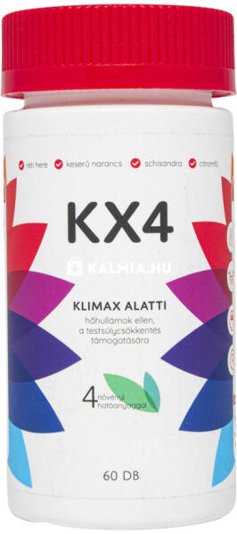 Kapszula a klimax alatti tünetek enyhítésére. Termékismertető: KX4 Kapszula a klimax alatti tünetek enyhítésére növényi kivonatokkal. Segít a hőhullámok ellen, támogatja a testsúlycsökkentést négy növényi hatóanyaggal. A réti here segít elviselni a hőhullámokat és az izzadást. A keserű narancs támogatja a zsír és szénhidrát anyagcserét, segíti a zsírbontást,