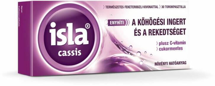 Az Isla® cassis a megfázás és torokfájás tipikus tüneteinek enyhítésére szolgáló C-vitamin tartalmú, feketeribizli ízű torokpasztilla. Az izlandi zuzmó kivonatot tartalmazó isla® cassis torokpasztilla nyugtatja a köhögési ingert, és enyhíti a rekedtséget. 4 éves kortól adható, cukormentes, feketeribizli ízű torokpasztilla, amely C vitamint is tartalmaz. Az isla® cassi