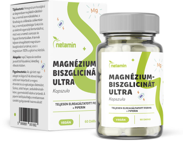 Netamin Magnézium-biszglicinát ULTRA kapszulaNapi 200 mg magnézium (100% magnézium-biszglicinátból) + felszívódást segítő piperin!A magnézium egyik legjobban felszívódó és a gyomorhoz legkíméletesebb formájaA magnézium hozzájárul a normál izomműködéshez, idegrendszeri működéshez, a fáradtság és a kifáradás csökkentéséhezKutatások alapján a magnézium-biszglic