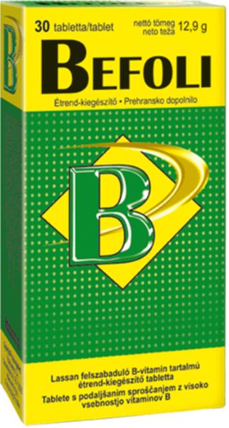 Jellemzők Lassan felszívódó magas hatóanyag-tartalmú B-vitamin komplex a fáradtság leküzdésére. A Befoli magas koncentrátumban tartalmazza szervezetünk számára a legfontosabb B-vitaminokat (B1, B2, Niacin, Pantoténsav, B6, B12, Folsav, Biotin). A tabletta, úgy lett kialakítva, hogy fokozatosan biztosítsa a szervezet számára a B-vitamin felszívódást, és hatása hosszantart