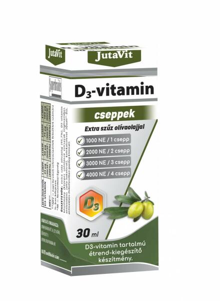 JutaVit D3-vitamin cseppek. Extra szűz olívaolajjal. 1000 NE / csepp. D3-vitamin tartalmú étrend-kiegészítő készítmény. 1000NE / 1 csepp 2000NE / 2 csepp 3000NE / 3 csepp 4000NE / 4 csepp A D-vitamin a zsírban oldódó vitaminok családjába tartozik. A JutaVit D3-vitamin cseppek a D-vitamint extra szűz olívaolajban oldott formában tartalmazza. A D-vitamin hozzájárul a kalcium és
