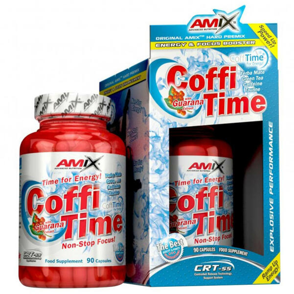 Csomagolás: 90 kapszula Koffeint tartalmaz. Nem ajánlott gyermekeknek vagy terhes nőknek. (Koffeintartalom – 198,4 mg adagonként / 1 kapszula) CoffiTime® egy erős kiegészítő, amelyből a következőkből áll: koffein dúsítva Guarana kivonattal, zöld tea kivonattal, Yerba Mate kivonattal és Taurinnal . A koffein tulajdonságai: javítja a teljesítményt, a kitartást és késleltet