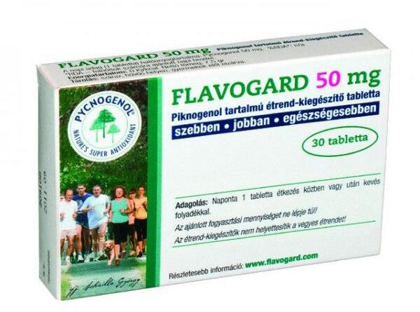 Flavogard 50 mg tabletta 30dbA Flavogard 50 mg étrendkiegészítő tabletta az első magyar Pycnogenol tartalmú étrendkiegészítő. Napjainkban a Pycnogenol az egyik legkutatottabb és legismertebb természetes anyag világszerte. A Flavogard a gyógyszeripari követelményeknek megfelelően készül, kizárólagosan természetes anyagokat tartalmaz. A Pycnogenol táplálkozási alternatívát