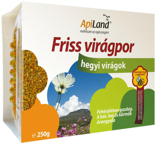 Apiland nyers hegyi virágpor 230 g "Az ApiLand nyers hegyi virág virágpor fehérjékben, B2, B8, C és E vitaminokban, cinkben, szelénben és antioxidánsokban gazdag. Ezért a szép bőr, haj és körmök őrangyala. Csillogást, életerőt kölcsönöz a hajunknak. Erősíti a körmöket. Segít fenntartani külsőnk egészséges megjelenését. Életerővel tölti fel szervezetünket Kalór