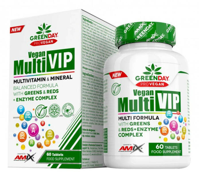 MULTIVITAMIN ÉS ÁSVÁNYI ANYAG A legteljesebb formula, amely vitaminok és ásványi anyagok nagy hatásfokú keverékét biztosítja. A GreenDay® ProVegan Multi VIP a legteljesebb formula, amely a vitaminok és ásványi anyagok nagy hatékonyságú keverékét, valamint egy teljes gyümölcs- és zöldségkomplexet és D-vitamint tartalmaz. A GreenDay® ProVegan Multi VIP speciális bevonatta