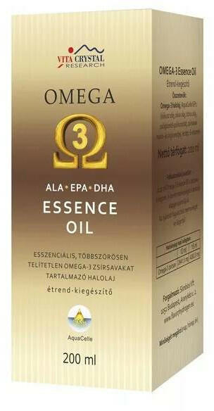 Vita Crystal Omega3 Essence oil 200 mlAz Omega3 Essence Oil számos egyedülálló elõnnyel rendelkezik: – Vízben oldódó formula: Az Omega-3 olaj könnyen oldódik vízben, így nem tapad a szájpadlásra. – Hatékony biohasznosulás: Az AquaCell technológia növeli az Omega-3 olaj biohasznosulását a szervezetben. – Természetes összetevõk: Csak a tiszta és természetes Omega-3 ola