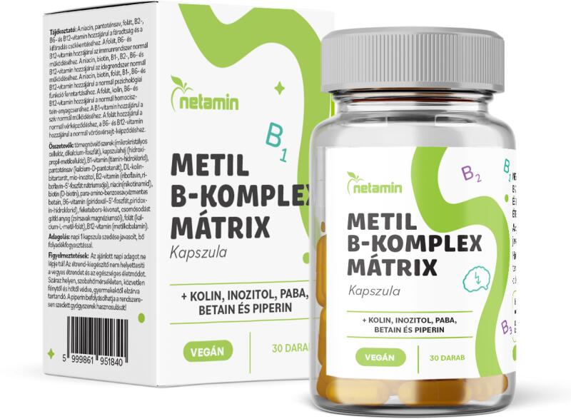 Netamin Metil B-komplex Mátrix kapszula. Teljes spektrumú, mind a 8 létfontosságú B-vitamint tartalmazó készítmény. A legjobban hasznosuló és biológiailag legaktívabb formákkal…B2-vitamin riboflavin és riboflavin-5’-foszfát formákban…B6-vitamin piridoxin-hidroklorid és piridoxál-5’-foszfát formákban…aktív, metilált B9- és B12-vitaminnal (folát és metilkobalamin)