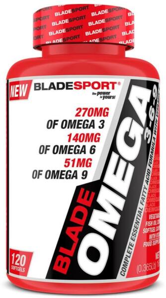 Blade Omega 3 - 120 kapszula minden adagja 1000 mg prémium halolajat , 120 mg DHA-t és 180 mg EPA-t tartalmaz . Szedj BLADE OMEGA 3 zsírsavat , mert az OMEGA 3 számos tudományosan bizonyított pozitív hatással bír szervezetünkre. A BLADE OMEGA 3 esszenciális zsírsav formula Eikozapenténsavat (EPA) és Dokozahexaénsavat (DHA) tartalmaz. Ezek a zsírsavak az humán táplálkozásában m