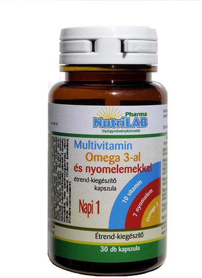 NutriLAB Multivitamin Omega 3-mal és nyomelemekkel étrend-kiegészítő kapszula 10 vitamin 7 nyomelem Omega 3 Tartalom: 30 kapszula Kapszula súlya: 1463 mg Nettó tömeg: 43,9 g Ajánlott napi mennyiség: Napi 1 kapszula bevétele javasolt. Felhasználási javaslat: A NutriLAB Multivitamin Omega 3-mal és nyomelemekkel kapszulát ajánlott tetszőleges mennyiségű folyadékkal, étkezések k