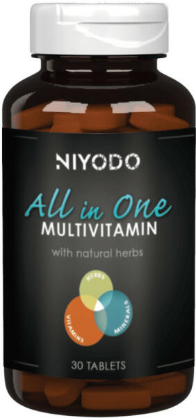 OGYÉI notifikációs szám: 24638/2020 All in One multivitamin - 30 tabletta - NIYODONapi adag 1 db tabletta1 havi adag (30 tabletta)Napi adag tartalmazA-vitamin1500gRE - 5000NE*NRV 215%B1-vitamin4,2mg*NRV 383%B2-vitamin4,6mg*NRV 329%Niacinamid16mg*NRV 100%Pantoténsav10mg*NRV 168%B6-vitamin4,6mg*NRV 329%Biotin54g*NRV 108%Folát400g*NRV 200%B12-vitamin21,6g*NRV 1048%C-Vitamin180mg*NRV 225%D3-vita