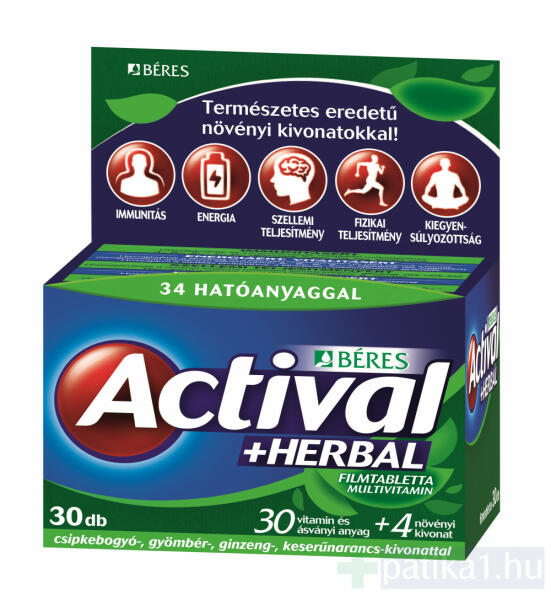 Actival +Herbal filmtabletta komplex étrend-kiegészítő multivitamin, ásványi anyagokat, növényi kivonatokat, rutint, likopint és luteint tartalmazó készítmény. Az Actival +Herbal multivitamin filmtabletta 34, a szervezet számára fontos hatóanyagot tartalmaz. Az alapvető vitaminokon, ásványi anyagokon és nyomelemeken kívül 4-féle természetes eredetű növényi kivonat is meg