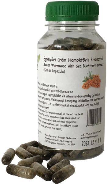 NATESSENCE EGYNYÁRI ÜRÖM HOMOKTÖVIS KIVONATTAL KAPSZULA 120DBArtemisia annua és homoktövisAz egynyári üröm morzsolt tea levél fogyasztása az egészségtudatos étrend megfelelő kiegészítője. Számos hiteles tudományos kutatás támasztja alá az egynyári üröm pozitív élettani hatásait. A homoktövis az egyik legtáplálóbb és vitaminokban gazdag gyümölcs, közel 250 biol