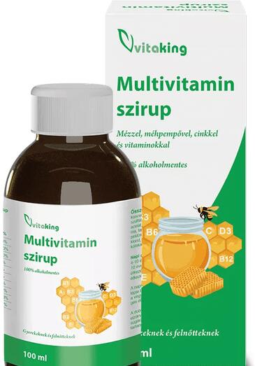 Vitaking Multivitamin szirup 100ml - a Toner webáruház Egészségmegőrzés > VITAMIN kategóriájában kedvező 3670-os áron. Rendeljen Vitaking Multivitamin szirup 100ml terméket tőlünk gyors kiszállítással! Foly ékony multivitamin szirup mézzel és méhpempővel A Vitaking Multivitamin szirup vitaminokat és cinket tartalmazó folyékony étrend-kiegészítő méhpempővel. 100% a