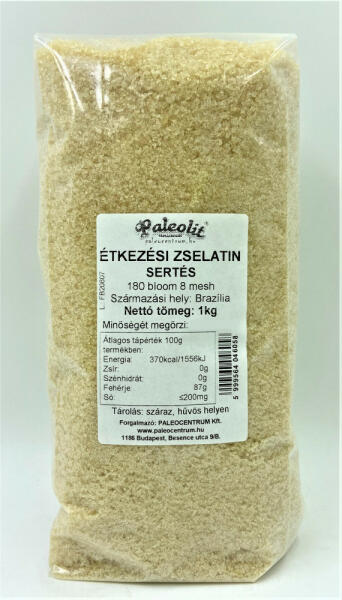 ZSELATIN ÉTKEZÉSI, SERTÉS 200 BLOOM 1KG Nagy tisztaságú, finom szerkezetű, étkezési minőségű sertés zselatin. Ízületi gondok, porckopás megoldására is használhatjuk a zselatint. ZSELATIN ÉTKEZÉSI, SERTÉS 200 BLOOM 1KG A zselatin 5-szörös mennyiségű vizet képes felvenni. A legelterjedtebb állati eredetű zselésítő anyag, ezért élelmiszerekben és gyógyszerekben szé