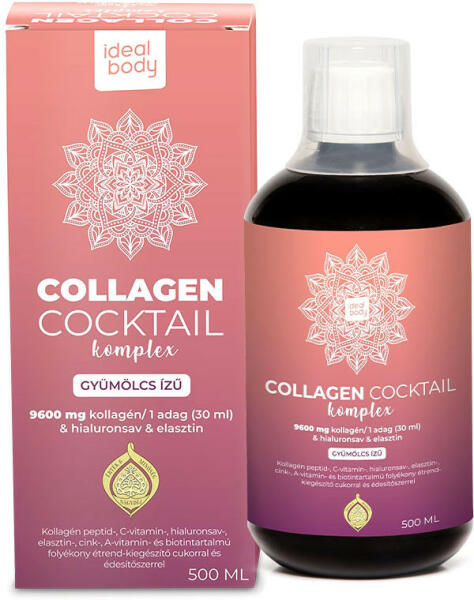COLLAGEN COCKTAIL komplex szépségápolási étrend- kiegészítő 9600 mg hidrolizált kollagénnel. Hialuronsavval , elasztinnal, A- és C- vitaminnal, biotinnal és cinkkel dúsított készítmény. Ízesítés: gyümölcsös Kiszerelés: 500ml Adagolás: A napi ajánlott adag 30 ml COLLAGEN COCKTAIL, mely 9 600 mg kollagén-peptidet tartalmaz. Összetevők: 9600 mg kollagén-peptid, hialurons