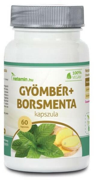 Netamin Gyömbér + Borsmenta kapszula - 60 kapszula. Gyömbér őrlemény és porított borsmenta levél növényi kapszulában!2 gyógynövény az emésztőrendszer támogatásáért. A gyömbér támogatja az emésztést, hozzájárul az emésztőrendszer normál működéséhez. A borsmenta szélhajtó és görcsoldó hatása révén segíthet fokozott bélgázképződés és hasi görcsök, g