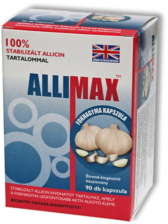 100% stabil allicint tartalmaz, amely a legfontosabb hatóanyaga a fokhagymának. - Bioaktív hatása bizonyított- Irritáló íz- és illatmentes fokhagyma kivonat- Egy kapszula 10-15 gerezd fokhagyma aktív összetevőit tartalmazza- Az Allimax jól viseli a gyomorban található savas közeget. A felszívódás is itt történik és a véráramba kerülve azonnal kifejti jótékony hatását J