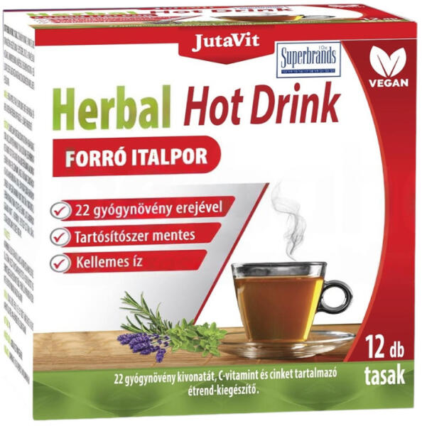 22 gyógynövény kivonatát, C-vitamint és cinket tartalmazó étrend-kiegészítő cukorral és édesítőszerrel. Citrus íz. JutaVit Herbal Hot Drink Forró Italpor 12 db tasak / doboz 22 gyógynövény kivonatát, C-vitamint és cinket tartalmazó étrend-kiegészítő cukorral és édesítőszerrel. Citrus íz. A C-vitamin és a cink hozzájárul az immunrendszer normál működéséhez. Az
