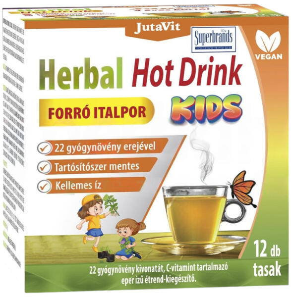 22 gyógynövény kivonatát, C-vitamint tartalmazó eper ízű étrend-kiegészítő édesítőszerekkel. JutaVit Herbal Hot Drink KIDS Forró Italpor 12db tasak/doboz 22 gyógynövény kivonatát, C-vitamint tartalmazó eper ízű étrend-kiegészítő édesítőszerekkel. EAN kód: 5999887075162 Adagolás: 4 éves kortól 3-6 tasak naponta. Egy tasak (7g) port oldjon fel forró, de nem forrásb
