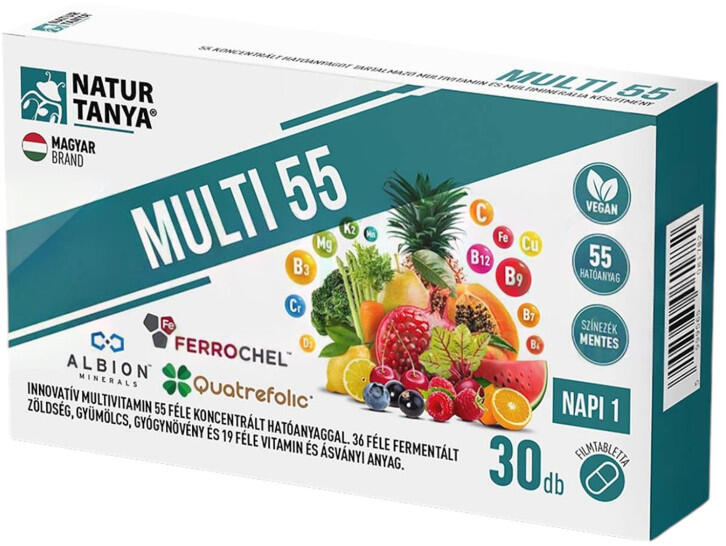 A Natur Tanya® Multi 55 tudatosan fejlesztett, fermentált multivitamin komplex. Összesen 55 koncentrált hatóanyaggal, melyből 36 féle fermentált zöldség, gyümölcs, gyógynövény és 19 féle vitamin és ásványi anyag. A formula szabadalommal védett, 4 lépcsős fermentációs technológiával készül, az összetevők között megtaláljuk a világszabadalommal védett bioaktív fo