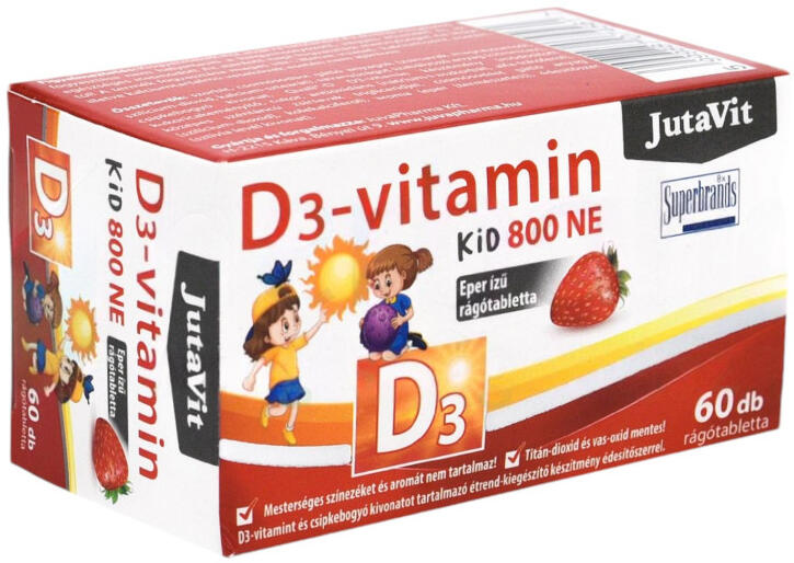 JutaVit D3-vitamin Kid 800NE (20g). Eper ízű rágótabletta. Mesterséges színezéket és aromát nem tartalmaz. D3 vitamint és csipkebogyó kivonatot tartalmazó étrend-kiegészítő készítmény édesítőszerrel. Titán-dioxid és vas-oxid mentes! A D3-vitamin hozzájárul a kalcium és foszfor normál felszívódásához/hasznosulásához, a vér normál kalcium-szintjének fenntartásá