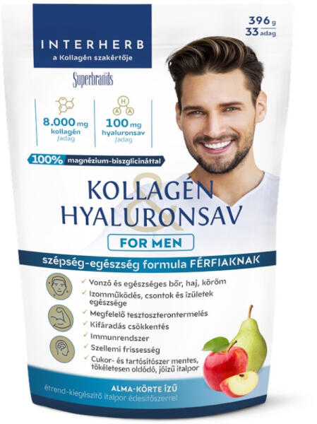 ? Vonzó és egészséges bőr, haj, köröm ? Izomműködés, csontok és ízületek egészsége ? Megfelelő tesztoszterontermelés ? Kifáradás csökkentés ? Immunrendszer ? Szellemi frissesség ? Cukor- és tartósítószer mentes, tökéletesen oldódó, jóízű italpor Interherb Kollagén & Hyaluronsav FOR MEN szépség-egészség formula Férfiaknak alma-körte ízű étrend-kiegész