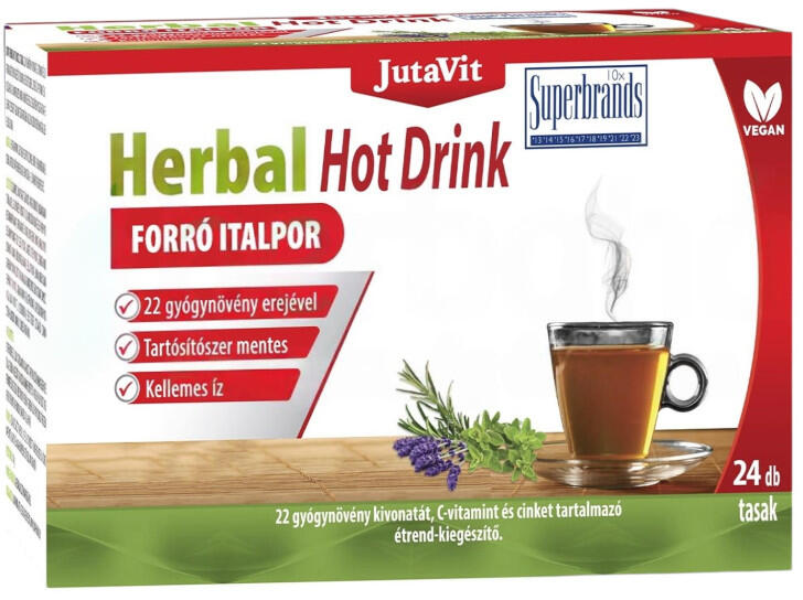 22 gyógynövény kivonatát, C-vitamint és cinket tartalmazó étrend-kiegészítő cukorral és édesítőszerrel. Citrus íz. JutaVit Herbal Hot Drink Forró Italpor 24db tasak/doboz . 22 gyógynövény kivonatát, C-vitamint és cinket tartalmazó étrend-kiegészítő cukorral és édesítőszerrel. Citrus íz. A C-vitamin és a cink hozzájárul az immunrendszer normál működéséhez. Az