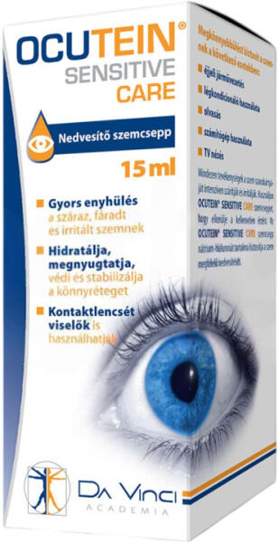 Ocutein Sensitive Care nedvesítő szemcsepp gyors enyhülést hoz a száraz, fáradt és irritált szemnek. Hidratálja, megnyugtatja, védi és stabilizálja a könnyréteget. Kontaktlencsét viselők is használhatják. Felbontás után 90 napig felhasználható.