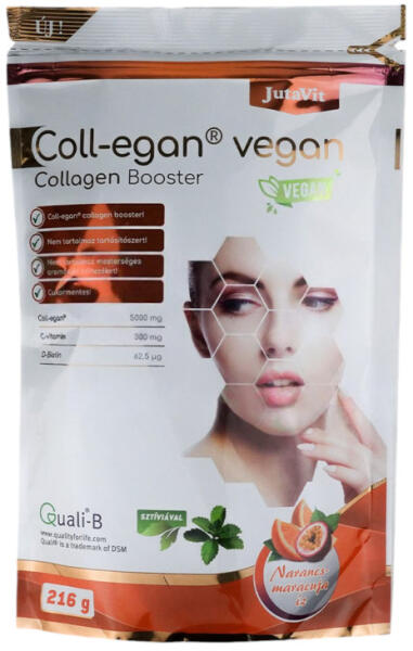 JutaVit Coll-egan Vegan Collagen Booster 216g – Narancs-maracujaColl-egan ® komplexet (L-glicin, L-hidroxiprolin, L-glutaminsav, L-alanin, L-arginin, bambusz kivonat, L-prolin, acerola gyümölcspor, karobpor) és biotint tartalmazó értend-kiegészítő készítmény édesítőszerekkel narancs-maracuja ízben. Nem tartalmaz mesterséges aromát és színezéket! Nem tartalmaz tartósítósze
