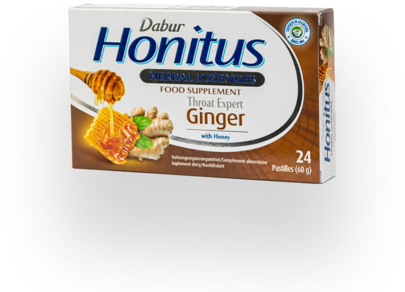Dabur Honitus Gyömbér Ízű Szopogató Tabletta 24 db Gyógynövényes szopogató tabletta a torokfájás enyhítésére, a légutak egészségének támogatására gyömbér ízben. A természetes gyógynövényi összetevőkkel készülő Dabur Honitus Ginger gyömbér ízű gyógynövényes szopogató tabletta a méz és az indiai egres (amla) antioxidáns hatásának köszönhetően támogat