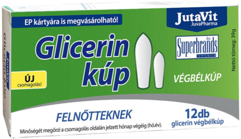 JutaVit 12 db Glicerin végbélkúp FelnőtteknekHatásmechanizmus: Fellazítja és nedvesíti a székletet, megkönnyítve annak kiürülését. Használati utasítás: Vegye ki a végbélkúpot az alumínium buborékfóliából és a kúp keskenyebbik felével helyezze be teljesen a végbélbe. Figyelmeztetés: Kizárólag végbélnyíláson keresztül történő használatra! Kisgyermekek elől