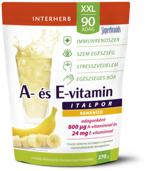 Kellemes ízű, A- és E-vitamint jelentős mennyiségben tartalmazó italporunkat az immunrendszer támogatásához, a stressz elleni védelemhez, valamint a szem és a bőr egészségének megőrzéséhez fejlesztettük ki. adagonként 800 μg A-vitaminnal és 24 mg E-vitaminnal a szervezet vitaminellátásának támogatására finom banánízű, jól oldódó italpor természetes módon glut