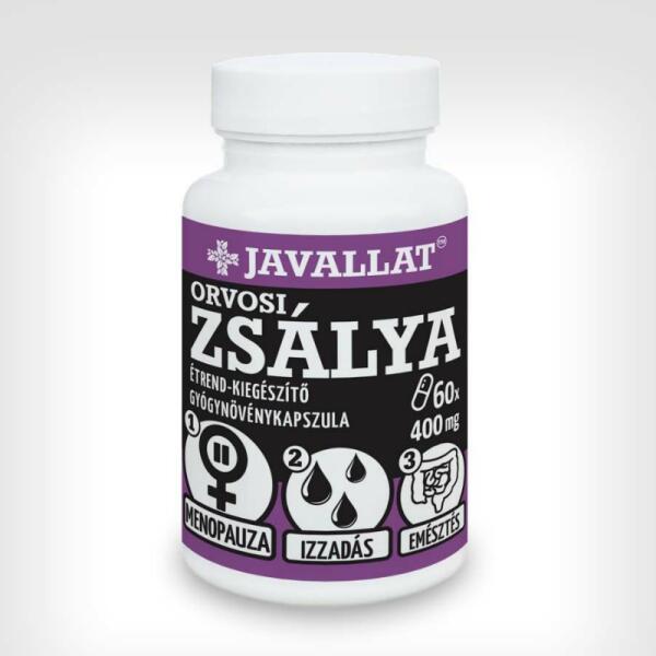JAVALLAT ORVOSI ZSÁLYA KAPSZULA 400 mg 60 db szuperfinom instant gyógynövényport tartalmazó étrend-kiegészítő gyógynövénykapszula, bevizsgált, kiváló minőségű gyógynövénybőlAz orvosi zsálya egészségügyi hatásai:1. Elősegíti a menopauza alatti jó közérzetet. 2. Hozzájárul az izzadás mérsékléséhez. 3, Támogatja az emésztés egészségét, az étkezés utáni