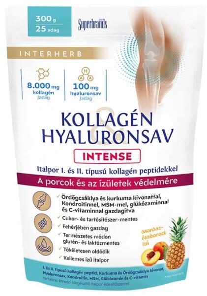 Interherb Kollagén & Hyaluronsav INTENSE italpor ananász-őszibarack ízű 300 g 25 adag A porcok és az ízületek védelmére. Az aktív életmód fenntartásában kiemelt szerepet kap az ízületek rugalmasságának, terhelhetőségének megőrzése. Ehhez járulnak hozzá kiválóan oldódó, finom ízű étrend-kiegészítő italporunk gondosan válogatott hatóanyagai, amelyeket kész