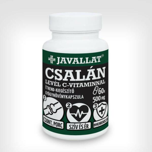 60 db instant gyógynövényport és C-vitamint tartalmazó étrend-kiegészítő gyógynövénykapszula, bevizsgált, kiváló minőségű gyógynövényből. A csalánlevél: támogatja a szív- és érrendszer egészségét, hozzájárul az immunrendszer normál működéséhez. A C-vitamin: hozzájárul a normál kollagénképződéshez, ezen keresztül a csontozat, a porcok, a fogíny és fog