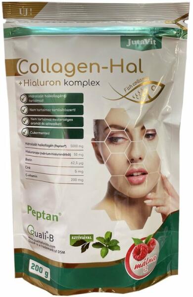 JutaVit Collagen-Hal + Hialuron komplex 200g – Málna íz Hidrolizált halkollagént, hialuronsavat, biotint, szerves cinket és C-vitamint tartalmazó étrend-kiegészítő készítmény édesítőszerekkel málna ízben. Nem tartalmaz mesterséges aromát és színezéket! Nem tartalmaz tartósítószert! Cukormentes! A kollagén a bőrszövet egyik természetes alkotóeleme. A termékben tal